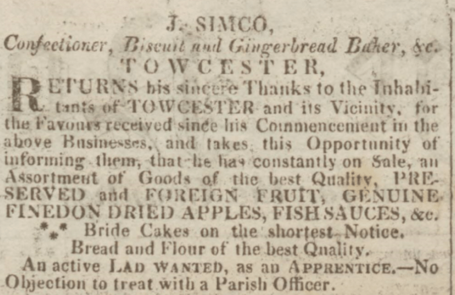 J. Abel was not the only person known to have acted as an agent for the sale of Finedon dried apples. The Northampton Mercury of Christmas Day 1819 records J. Simco of Towcester was selling “GENUINE FINEDON DRIED APPLES”.