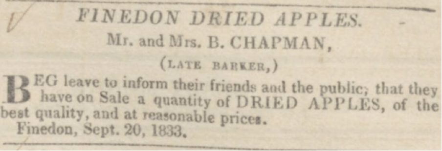 In the October 1829 editions of the Northampton Mercury two Finedon producers and suppliers of dried apples are vying for custom.