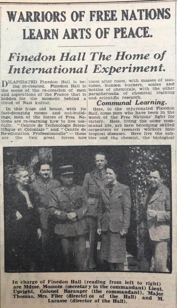 Following the death of Miss Ellen Mackworth-Dolben in 1912 Finedon Hall passed through several owners who did nothing or very little to maintain the property. At one point it found its way into the ownership of the Bishop of Portsmouth “for the benefit of a diocesan scheme”. Some renovation work did commence with the intention of using the Hall as a rest home for retired clergy – this was never finished. Then, in 1936, Finedon Hall was sold to Major Greaves of Thingdon Cottage (brother of the Rev. Greaves, Vicar of Finedon, 1911 – 1928). Major Greaves kept the Hall empty until it was used by the Free French army during the war.